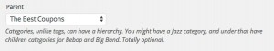 If your category does not have a parent category click “Add New Category” as seen above. If your category is part of a another category such as “Books”, “News”, “Coupons”, etc… You can select the parent category in the “Parent” dropdown list seen below.